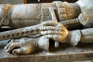 Латные рукавицы и меч; фрагмент надгробия рыцаря и его супруги, 1391 г. Элфорд, Стаффордшир
