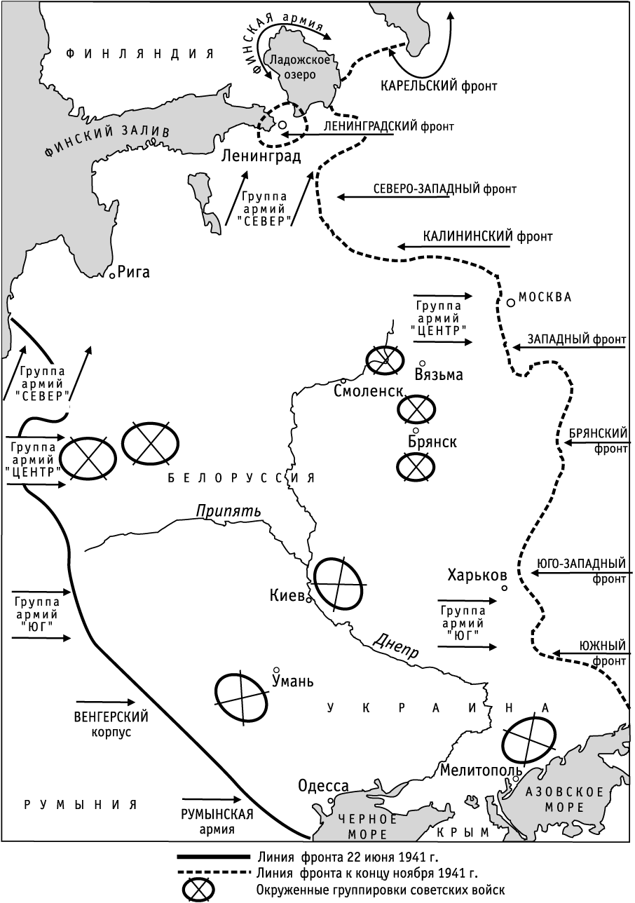 22 июня 1941 г. германские войска перешли границу с СССР. На первых порах им сопутствовал успех. Вражеская авиация неожиданным ударом уничтожила значительную часть советских самолетов еще на аэродромах, что позволило ей завоевать господство в воздухе. Группа армий «Центр», наиболее сильная группировка врага, окружила советские вой ска под Белостоком и Минском. В результате основная часть наших сил, предназначенных для обороны Белоруссии, была ликвидирована. Быстро двигаясь на восток, немцы заняли всю Белоруссию и подошли к Смоленску. Две другие группы армий не смогли окружить, как им было предписано, крупные силы Красной армии в приграничных районах. Однако они уверенно продвигались вперед в Прибалтике и на Украине, имея в авангарде танковые и моторизованные части.