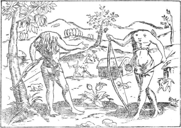 Это — обитатели Индии, какими их представляли себе во времена средневековья. В этой книге были описаны и другие нелепые уроды: люди с одним бедром, будто бы способные, несмотря на это, очень быстро бегать и имеющие такую длинную и широкую ступню, что они могли прикрываться ею от солнца, как зонтиком, и гиганты-циклопы, и двухголовые карлики, и ацефалы, то есть люди, лишенные головы, с лицом на груди, и, наконец, киноцефалы (собакоголовые), о которых в книге самым серьезным тоном рассказывалось следующее: