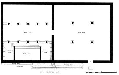 Южная часть помещения была отделена парапетами высотой по грудь, построенными между колоннами (сохранилась дорическая капитель от этой колоннады). В эту часть бань вела лестница – в купальные камеры и бассейн. Центральный бассейн был отделен от небольших сухих помещений стенками на высоту заполнения водой. Каждое из боковых помещений (купальных камер) было снабжено четырьмя каменными умывальниками, вода в которые подводилась по каналам через стены и отводилась отверстия в полу.