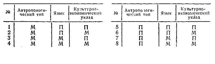 Попытаемся подобрать исторические примеры для каждого из восьми вариантов (с неизбежными упрощениями). 1. О. Питкерн; большая часть вепсского населения в процессе колонизации. 2. Балкарцы, карачаевцы (см. выше). 3. Охотники прерий (преимущественно культурные заимствования). 4. Булгарское завоевание территории современной Болгарии; завоевание Египта гиксосами. 5. Меря, чудь заволочская - славянская колонизация. На варианты 1-5 примеры подбирать несложно; их число можно легко увеличить. А примеров на варианты 6 - 8 практически кет! Именно это и подтверждает иллюстрируемый нами тезис. Правда, возможны и исключения. Приведенные примеры соответствуют наиболее часто встречающейся ситуации, когда пришлое население занимает на какое-то время господствующее положение на новой территории; обычно это связано с завоеванием территории. Однако распространение антропологического типа может быть следствием и такого перемещения человеческих масс, когда пришлое население занимает подчиненное или, во всяком случае, не очень заметное положение. При этом может возникать очаг нового антропологического типа, не сопровождаемый переносом языка и культуры. Примерами могут служить "палоци" - уже упоминавшиеся потомки половцев в Венгрии, или негры США; оба примера соответствуют в таблице варианту 8. Антропологические особенности не остаются постоянными, а изменяются во времени, в условиях изоляции, под воздействием естественной и социальной среды. Изменение антропологического типа во времени было открыто Г. Ф. Дебецом на палеоантропологических материалах с территории СССР [85], а затем обнаружено и на других территориях. Эпохальные изменения антропологических признаков нашли выражение в процессах брахикефализации и грацилизации, проявляются независимо от этноса и территории и отчасти сближают этносы между собой. Поэтому антропологические данные с одной территории, разделенные значительным интервалом времени, необходимо рассматривать с учетом эпохальной изменчивости, даже в случае исторически зафиксированных миграций. Например, на территории Приуралья на протяжении почти двух тысяч лет сохранялся однородный местный антропологический тип, несмотря на интенсивную иммиграцию, следы которой прослеживаются по разнообразию археологических культур. Различия в физическом облике населения этой территории объясняются в основном эпохальными изменениями биологического характера [4]. Антропологические типы изменяются и в условиях изоляции. К настоящему времени установлено, что на определенных территориях под воздействием и в зависимости от степени изоляции, смешения и демографической структуры расообразовательный процесс принимает особую форму-модус расообразования [7]. В случае социальной или географической изоляции, при ограничении свободы заключения брака имеет место модус типологической изменчивости, при котором происходит резкая территориальная дифференциация антропологических типов. Яркий пример генетических последствий социальной изоляции дает Индия. В Индии насчитывается более тысячи каст. Представители высших каст обладают резко выраженными европеоидными чертами, а среди низших преобладают черты веддоидной (т. е. относящейся к большой экваториальной расе) и южноиндийской (промежуточной между веддоидной и южной европеоидно