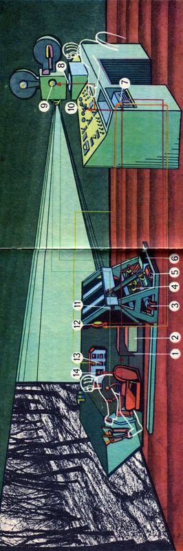 1 — блок датчиков; 2 — датчик поворота; 3 — балансир; 4 — силовой цилиндр; 5 — электромотор; 6 — гидропривод; 7 — магнитофон; 8 — механизм поворота; 9 — мотор; 10 — тахометр; 11 — ось качания; 12 — динамик; 13 — стартер; 14 — тахометр.