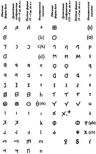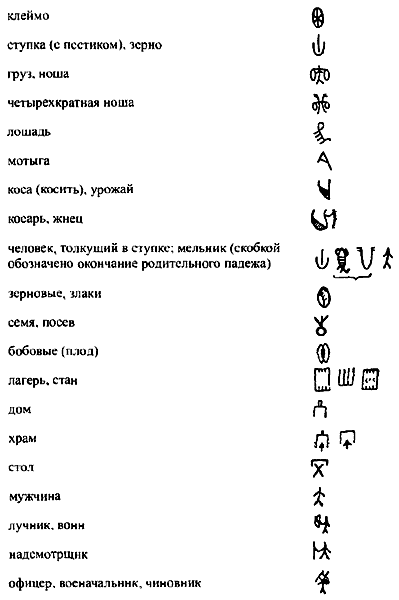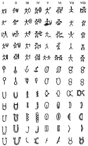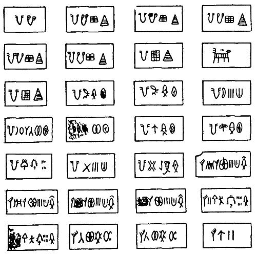 Знаки эти, как показывает уже беглое ознакомление с ними, имеют или стилизованный рисуночный, или линейный характер. Если же при этом мы учтем число знаков, которое слишком велико для того, чтобы говорить о слоговом письме, и слишком незначительно для чисто «словного» письма, то сам собой напрашивается вывод о том, что речь должна идти о смеси идеограмм и фонетических знаков.