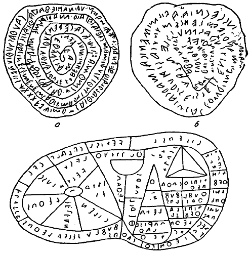 Рис. 183. Вверху — свинцовая табличка из Мальяно. Текст расположен по спирали: а — лицевая сторона: б — оборотная; внизу — бронзовая печень из Пьяченцы.