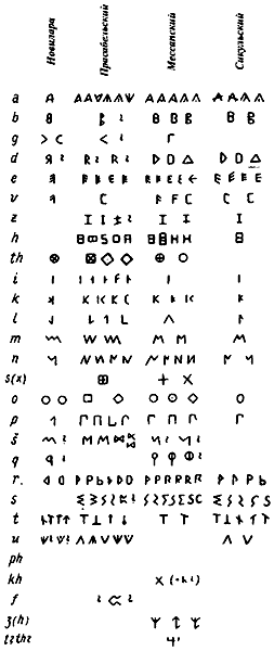 Рис. 184. Алфавит из Новилары, «древнесабельский», мессапский и сикульский алфавиты.