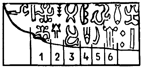 Рис. 193. «Ронго, господин неба и земли, который создал свет» — начало надписи на табличке с острова Пасхи. Перевод по Томасу Бартелю: 1 — господин, 2 — неба; 3 — Ронго (имя бога); 4 — земли; 5 — сделал; 6 — свет.