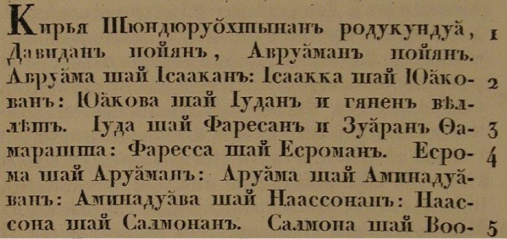 Карельский язык в Тверской Карелии более двухсот лет, вплоть до XIX века, существовал в бесписьменной форме[32]. Первое издание книги на карельском языке — Евангелия от Матфея, как я уже писал ранее, было осуществлено в 1820 году в Санкт-Петербурге по инициативе священников Тверской епархии Введенского Г.Е. и Золотинского М.А. Для этой цели им пришлось даже создать специальный алфавит, прибавив к русскому языку 13 отсутствовавших в нём букв. Но издание первой книги на карельском языке не повлекло за собой возникновение литературного карельского языка на Тверщине. Решающим негативным фактором здесь оказался временной разрыв в более чем шестьдесят лет между появлением первой печатной книги и открытием массовых земских школ для карельского населения в конце XIX века. У новой карельской литературы с 1820 года и до конца XIX века просто не оказалось читателей, поэтому очень скоро первый литературный опыт на карельском языке был основательно забыт.