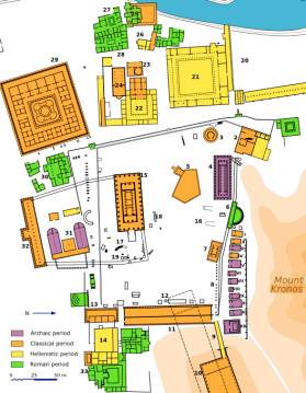 1. Пропилеи (северные ворота), 2. Пританий, 3. Филиппейон, около 335 г. до н. э., 4. Храм Геры, 5. Пелопион, 6. Нимфей Герода Аттика (2 в. до н.э.), 7. Метроон (Храм Матери), около 375 г. до н. э., 8. Заны (бронзовые "зевсы"), 9. Крипт ("тайный" вход на стадион), 10. Стадион, 11. Портик Эхо, 12. Здание Птолемея II и Арсинои (культ Филадельфов, 3 в. до н.э.) 13. Портик Гестии, 14. Эллинистическое строение, 15. Храм Зевса, 16. Алтарь Зевса, 17. Дар ахейцев (полукруглый постамент), 18. Дар Микифа (постамент с надписью), 19. Ника Пэония, 20. Гимнасий, 21. Палестра, 22. Теоколеон (дом жрецов), 23. Героон , 24. Мастерская Фидия, 25. Термы Кладея, 26. Греческие бани, 27 и 28. Гостиницы, 29. Леонидайон, 30. Южные термы, 31. Булевтерион (Совет) 32. Южный портик, 33. Вилла Нерона.