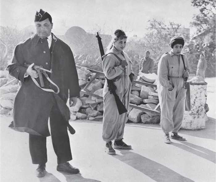 Тунисские женщины вместе с бойцами национальной гвардии, участвующие в охране баррикады в Бу-Фиша, преграждающей передвижение французских солдат. РГАКФД