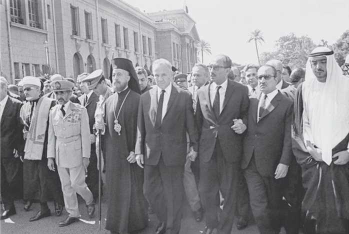 Президент Кипра архиепископ Макариос, Председатель Совета министров СССР А.Н. Косыгин среди лидеров арабских государств во время похорон Г. А. Насера. 1970 г. РГАКФД
