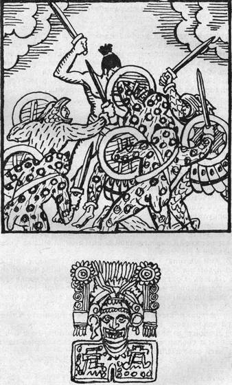 ...Прямо на него шел Тамалли, высоко подняв голову, сжимая в левой руке небольшой щит, а в правой — деревянную основу меча. Восемь ацтекских воинов — четверо в шлемах наподобие орла, четверо в шкурах оцелотов с боевыми мечами и щитами, — сопровождали Тамалли. Тамалли шел к Камню Солнца. Прославленный тлашкаланский воин был выбран для сражения в честь Нового огня.