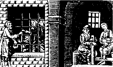 Внутренний режим в тюрьмах того времени был, разумеется, по сравнению с позднейшими временами, весьма свободным, хотя уже в конце XVI в. указ царя Федора Ивановича предупреждал, чтобы «тюремным сидельцам сидели было бережно и устрожно» (538-5, 227). Днем заключенным разрешалось гулять по тюремному двору. Часть из них, скованные общей цепью («на своре», «на связке») и под охраной солдат, могли покидать острог («пошед из острогу В мир» — 575, 127) для сбора милостыни Христа ради. За 1702 г. сохранилось описание таких цепей: «Две чепи долгих, что в мир ходят и с ошейниками, у них четыре замка висячих» (208, 298). По данным начала XVIII в. известно, что при выходах «на связке» заключенных сковывали подвое «по ноге в железах» (208, 472). В 1752 г. арестантов ковали по двое на «двушейную цепь», что, кстати, не мешало им успешно бежать на пару, потом они разбивали «камнем друг у друга цепи» (242, 35–36).