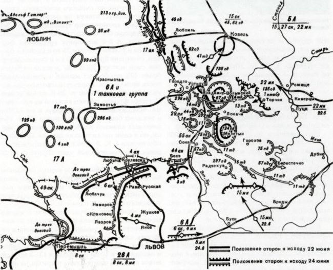 Клейст усиливал свою танко-моторизованную группу у Радехова, наращивая превосходство и нажим на 15-й мехкорпус. На корпус наседали две немецкие танковые дивизии, а подход наших 4-го и 8-го мехкорпусов задерживался. И все-таки 15-й остановил и сдерживал немецкое наступление, более того — 24 июня Карпезо смелой контратакой сбил противника с позиций и продвинулся вперед. Но этот успех, как и успех других атак, исчерпался фронтальным оттеснением немцев и нанесением им немалых потерь, но не привел к разгрому врага. Этого можно было достичь только сильным совместным ударом трех или всех механизированных корпусов ЮЗФ. Немцы, постоянно уклоняясь от лобовых атак 15-го МК, отходили и, нащупав слабые места в его фронте, бросали туда танковые части, угрожая перехватом коммуникаций. 24 июня Гальдер записал в дневнике: «Следует отметить упорство русских соединений в бою…».