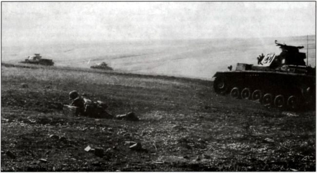 Атака немецких средних танков Pz.III подержанная пехотой. Лето 1941 г.