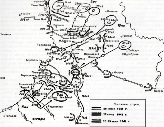 28-30 июня командование ЮЗФ приняло решение перейти в общее наступление с целью разгрома дубненско-острогской группировки врага. Ее предполагалось атаковать с трех сторон. С северо-востока удар наносили 9-й и 19-й мехкорпуса, с юго-запада — 8-й и 15-й мехкорпуса и 36-й и 37-й стрелковые, с востока — «группа Лукина». Но обстановка оказалась сложнее, чем казалось штабу фронта (схема 3 и 4).