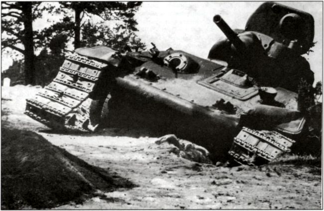 Т-34 обр. 1940 г., подбитый летом 1941 г. Танки первых выпусков вооружались 76-мм пушкой Л-11.