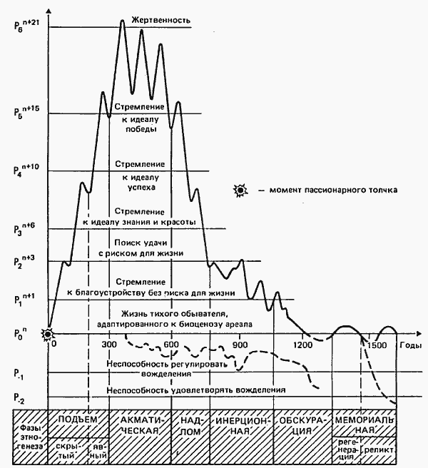 Время от времени гомеостаз прерывается эксцессом – возникновением пассионарных особей. Как при всякой мутации, их сначала немного, но они очень активны. Они действуют, чем усложняют первичную простую систему, создавая в ней много подсистем (субэтносов), блоков (конвиксий) и звеньев (консорций). Усложненная система обретает мощь и расширяет ареал. Ныне она даже выходит в космос. Но пассионарные особи часто гибнут, чем снижается энергетический уровень системы, возвращающийся к равновесному значению. В конце этногенеза остается немного гармоничных людей, как реликт, и так они живут, пока не произойдет новый взрыв или, точнее, мутация, т.е. толчок (от лат. muto – толкаю).