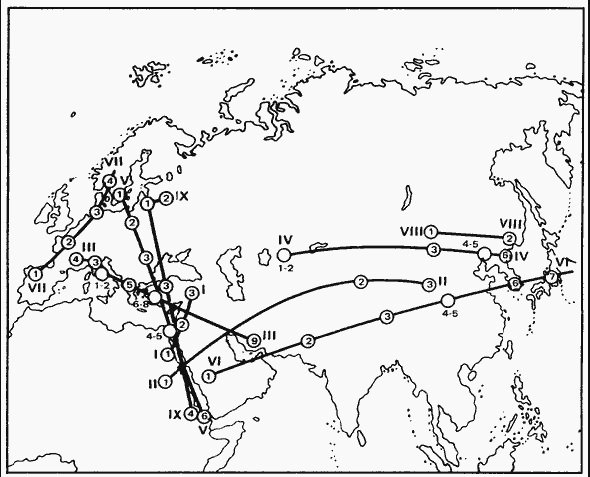Предложенная карта пассионарных толчков отражает состояние этнологии в настоящий момент (1984). Белые пространства на ней – временное явление. И глядя на них, не следует думать, что ни в Западном, ни в Южном полушариях толчков не было никогда. Конечно, они были, но когда и где конкретно проходили – этого с такой уверенностью, как для Евразии, пока сказать нельзя. Нет необходимых письменных источников. О толчках здесь мы можем говорить только с прибавкой «видимо». Видимо, ацтеки, муиски и инки появились в результате толчка, прошедшего на рубеже XI – XII вв. по линии от Аризоны до оз. Титикака. Эта линия также весьма близка к геодезической, как и остальные девять. В XIII в. н.э. началось расселение полинезийцев с островов Таити. II это движение, продолжавшееся до XVI в., бесспорно, пассионарный подъем. Такой же подъем мы наблюдаем в XIX в. у зулусов в Южной Африке. И тем не менее об этих толчках мы предпочли не говорить, фиксируя внимание только на достоверных, проверенных явлениях. При дальнейшем развитии этнологии число обнаруженных толчков, естественно, может увеличиться, может удлиниться и протяженность линий, уже найденных и отмеченных на нашей карте.