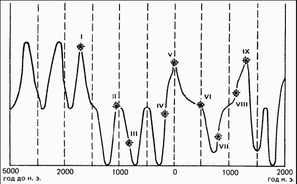 Каков характер этого излучения? Здесь мы можем строить только гипотезы. Их две. Первая – о возможной связи пассионарных толчков с многолетней вариацией солнечной активности, обнаруженной Д. Эдди [250]. Если наложить на его кривую (см. рис. на стр. 321) моменты толчков, то можно заметить, что четыре толчка попадают на максимумы и лишь один на минимум. Остальные лежат на точках перегиба кривой Эдди. Есть ли в этом какая-либо закономерность, нам, этнологам, сказать трудно. Ответ за астрофизиками. Вторая гипотеза – о возможной связи со вспышками сверхновых. Но таких совпадений нам известно только два. Толчку, имевшему место в конце I в. до н.э., как будто бы соответствует недавно обнаруженная звезда, вспыхнувшая в 5 году до н.э. [257], а толчку XI в. н.э. – появление Крабовидной туманности в 1054 году [247, стр. 211]. Может быть, это совпадение случайно.