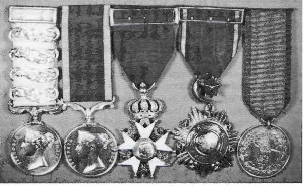 Награды капитана 46-го полка Далласа. Среди них — Крымская медаль с планкой «ALMA». В этом сражении полк не участвовал.