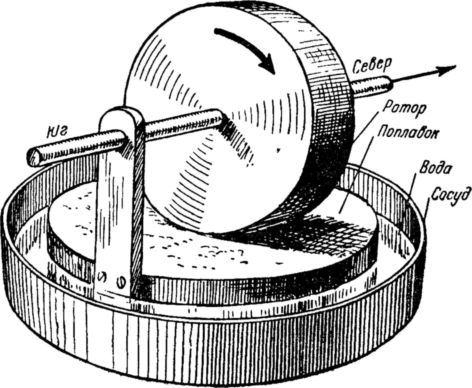 В другом месте земного шара, не на экваторе, ось ротора нашего гироскопа будет отклоняться, направляясь одним концом на Полярную звезду. Чем ближе к полюсу, тем выше поднимается ось гироскопа, а непосредственно на полюсе ось его занимает вертикальное положение, что неудобно. Это неудобство вскоре было ликвидировано путем помещения гироскопа в подшипниках, прикрепленных горизонтально к поплавку, находящемуся, например, в сосуде с водой. Этим достигли того, что гироскоп неизменно устанавливался по линии север — юг (рис. 32), т. е. гироскоп использовался как гирокомпас.