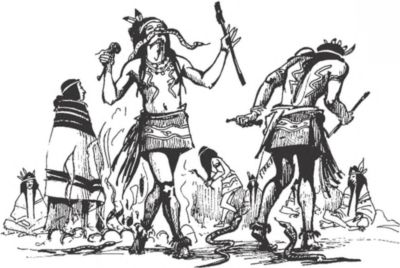 «…Мы пришли на небольшую площадь. Женщины и дети сидели вокруг центрального круга, где плясали мужчины. Многие индеанки курили трубки. Лица танцоров были разрисованы разноцветной краской а головы украшали плюмажи из пестрых птичьих перьев. Строго говоря, движения индейцев нельзя было назвать танцем, они переносили тяжесть тела с одной ноги на другую и совершали прыжки; при этом раздавался мелодичный звон, воспроизводимый маленькими колокольчиками, привязанными вокруг лодыжек, пониже колен и вокруг талии. В руках танцоры держали своеобразные музыкальные инструменты наподобие трещоток; их резкий звук сопровождал тягучую песню.