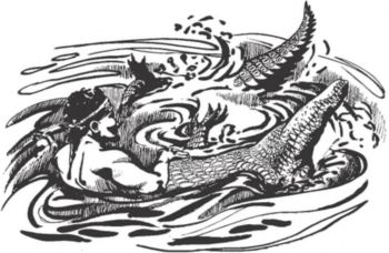 Из реки вынырнули и покачивались вблизи берега в терпеливом ожидании другие крокодилы. Но вот „секретарь“ выпрямился и решительным шагом направился к воде; тотчас же навстречу ему устремилась пара пресмыкающихся — своего рода представительная депутация для продолжения переговоров. По знаку все того же „секретаря“ мальчишки вступили с ними в игру: они садились на них верхом, ложились ничком, пускали страшенных животных в рысь, нимало не боясь ни мощных хвостов, ни оскаленных пастей. Возможно, в этой сцене не крылось ничего таинственного, возможно, здешние крокодилы уже давно-давно были приучены к таким номерам, но „переварить“ зрелище было нелегко…