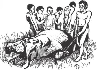 Чтобы «убить» свой запах, охотники измазывают себя экскрементами бегемота. И когда гиппопотам, не чуя опасности, отправляется на пастбище, охотники окружают животное и стреляют в него из луков и бросают дротики. Эта схватка может продолжаться несколько часов. А так как в поисках кормежки животное порой удаляется на несколько километров от водоема, спастись в родной стихии ему не всегда удается.