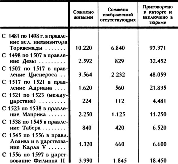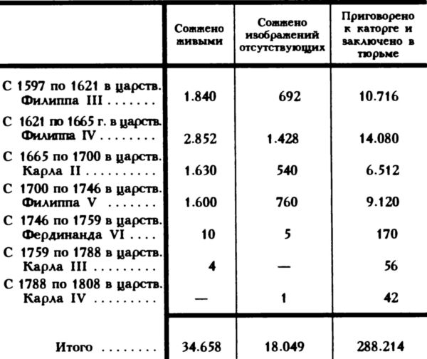 Таким образом общий итог жертв инквизиции в Испании за период времени с 1481 по 1826 год составляет 340.921 человек, не считая тех, кто был приговорен к тюремному заключению, к каторжным работам и к изгнанию в царствование Фердинанда VII, а число этих жертв весьма значительно.