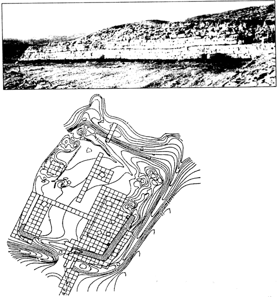 Рис. 5. Белокаменная стена и план Маяцкого городища (по Артамонову М. И.)