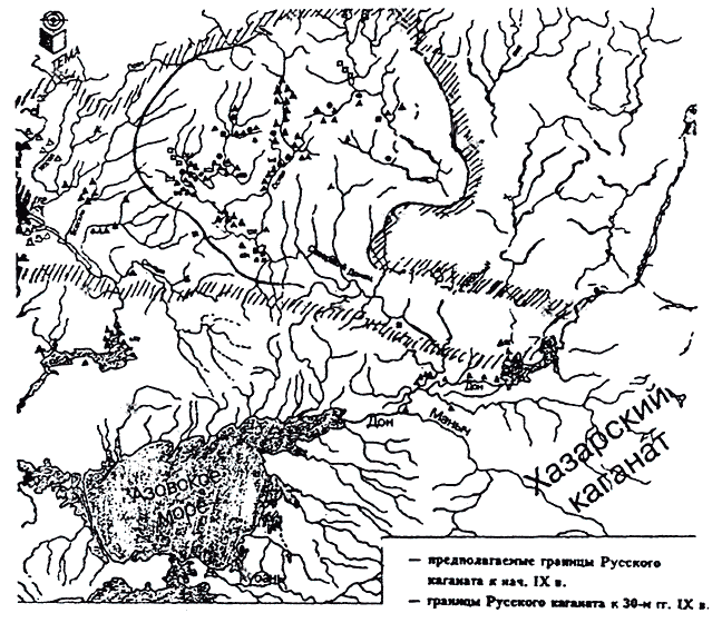 Рис. 7. Поселения и городища салтово-маяцкой культуры и границы Русского каганата (VIII–IX вв.) (по Галкиной Е. С.)