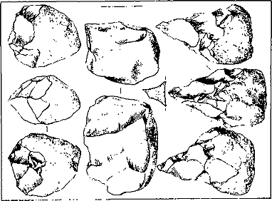 Как помнит читатель, Мэри Лики для Олдувайского ущелья со всей определенностью заявляет: люди с бифасами — пришельцы, люди, изготовлявшие только галечные орудия — чопперы и чоппинги, жили в долине Серенгети начиная от самых древних стоянок ущелья, и их техника не менялась в течение огромного промежутка времени.