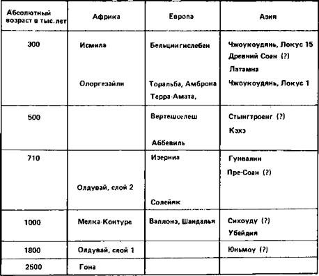 Конечно, как во всякой таблице, где различные археологические памятники расставлены по возрасту и произведено сравнение таких далеких континентов как Африка, Европа и Азия, в данной таблице сделаны определенные допущения, поскольку взяты очень большие блоки времени. К тому же для Азии датировка многих памятников имеет спорный характер. Но в целом таблица дает представление о синхронных культурах древнего палеолита в Старом Свете.