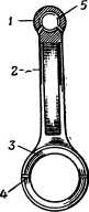 Рис. 31. Шатун двигателя мотоцикла М-72: 1 — малая головка; 2 — стержень шатуна; 3 — большая головка; 4 — выемка для выхода масла вверх; 5 — бронзовая втулка.