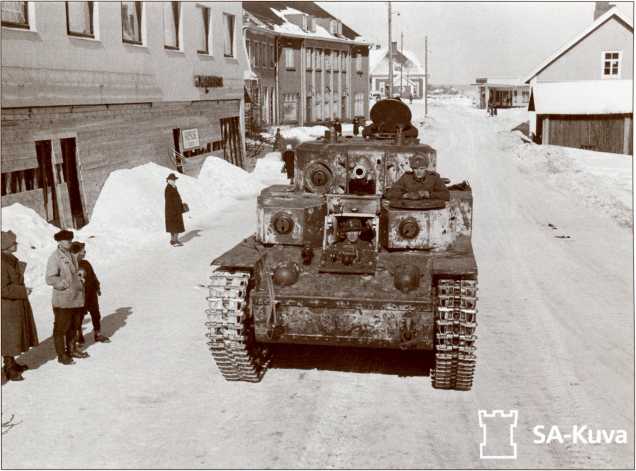 Этот неповрежденный Т-28 финны захватили в декабрьских боях в Сумманкюля или Ляхде. Танк едет по улицам города Варкауса, где находился завод по ремонту трофейных танков. В Зимней войне трофейные танки принять участия не успели.