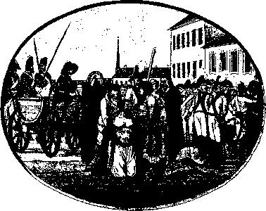 Приведенного или привезенного под усиленной охраной преступника пропускали внутрь цепи или каре стоявших на месте казни войск. В инструкции офицеру гвардии, командовавшему казнью Гурьевых и Хрущова, предписывалось расставить солдат в три шеренги «циркулем вокруг эшафота» (245; 244, 100–101). У солдат в оцеплении было две задачи: одна реальная, другая — гипотетическая. Во-первых, они сдерживали, подчас с трудом (об этом пишут все свидетели казней), народ, стремящийся подойти к эшафоту поближе. Во-вторых, организаторы казни опасались попыток отбить преступника, что происходит, кажется, только в современных исторических фильмах. Тем не менее в рапорте Петру I в 1708 г. о казни Кочубея и Искры сообщалось, что в момент экзекуции вокруг эшафота стояли «великороссийской пехоты три роты с набитым ружьем» (357, 140). Вокруг эшафота Разина стоял тройной кордон солдат, а войска, окружавшие в 1764 г. Лобное место, на котором казнили Мировича, также имели заряженные ружья «при полном числе патронов», причем все стоявшие в столице полки по первому сигналу могли выйти на улицы, на которых и так всюду были караулы (615, 119; 566, 479–480). С боевыми зарядами стояли солдаты на Болоте во время казни Пугачева в 1775 г. При экзекуции в Черкасске в 1800 г. к эшафоту прикатили четыре заряженные пушки, которые были поставлены по углам каре. Их стволы были нацелены в толпу, и артиллерийская прислуга держала наготове зажженные фитили (375, 574; 240, 119).