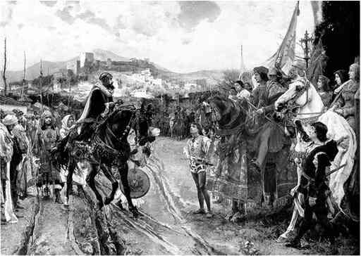 Эмир Боабдил сдает Гранаду Изабелле и Фердинанду (фрагмент). Худ. Франсиско Прадилья-и-Ортис (1882)