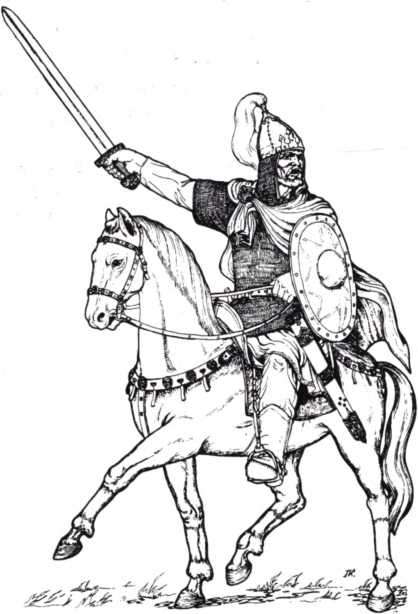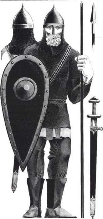 Давньоруський воїн XI — XII ст. Реконструкція за матеріалами розкопок. Малюнок Л. Андрієвського і В. Буйновського