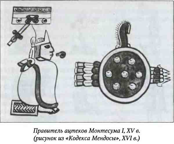 В раннем периоде существования Теночтитлана им управлял верховный вождь мешиков-ацтеков Теноч, исполнявший, вероятно, и важнейшие жреческие функции. Он умер в 1370 году, и тогда жители Теночтитлана решили повысить статус своего города путем приглашения на местный трон более престижного правителя со стороны, который бы устраивал также и их хозяев-тепанеков. Последним ацтеки должны были (кроме военной службы) платить и довольно тяжелую дань. После долгих раздумий выбор ацтекских старейшин пал на Акамапичтли («Пучок Тростника»): его отец был мешикским вождем, а мать — принцессой из Кульхуакана. Так возникла династия правителей Теночтитлана, управлявшая страной вплоть до испанского завоевания. По сути дела, ее представители могли ссылаться на свое прямое происхождение от тольтеков-кульхуа, а следовательно, на свое право владеть почти всей Мексикой9. Но вначале ацтеки были не настолько сильны, чтобы открыто высказывать свои далеко идущие планы. В регионе в то время имелась куда более грозная и могущественная сила — Тепанекское царство. Правда, время работало явно в пользу ацтеков.