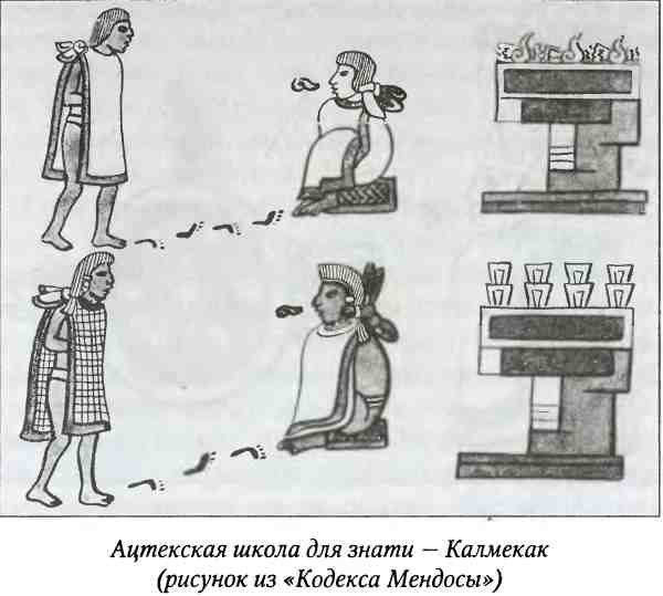 Но вернемся к описанию главного города ацтеков. В центре его, у пересечения двух основных улиц, находился «священный квартал», окруженный стенами огромный четырехугольник, внутри которого, обрамляя главную площадь, стояли храмы важнейших богов, а также жилища жрецов и их слуг. Дворец же правителя ацтеков — «текпан» — располагался хотя и вблизи этого священного квартала, но не имел с ним прямой связи. В текпане, помимо личных покоев правителя (ацтекск. «тлатоани» — «оратор») и его многочисленных жен и наложниц, находились правительственные учреждения (суды, военный и государственный совет и т. д.), казармы охраны, арсенал, помещения для слуг, мастерские ремесленников, покои для приезжих, зернохранилище и кладовые для поступающей дани. Таким образом, «текпан» был центром политико-административной и экономической жизни всего государства.