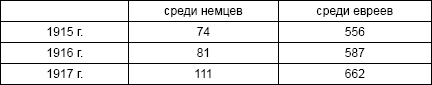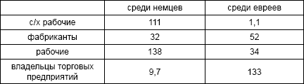 За несколько лет евреи заняли гораздо более высокое положение в экономической и культурной жизни. В 1921 г. была опубликована брошюрка «Еврейское влияние в Германии», составленная, как уверяет автор, по официальным статистическим данным и по данным прессы. Автор приводит очень яркие цифры. Например, вот некоторые данные о распределении по профессиям.