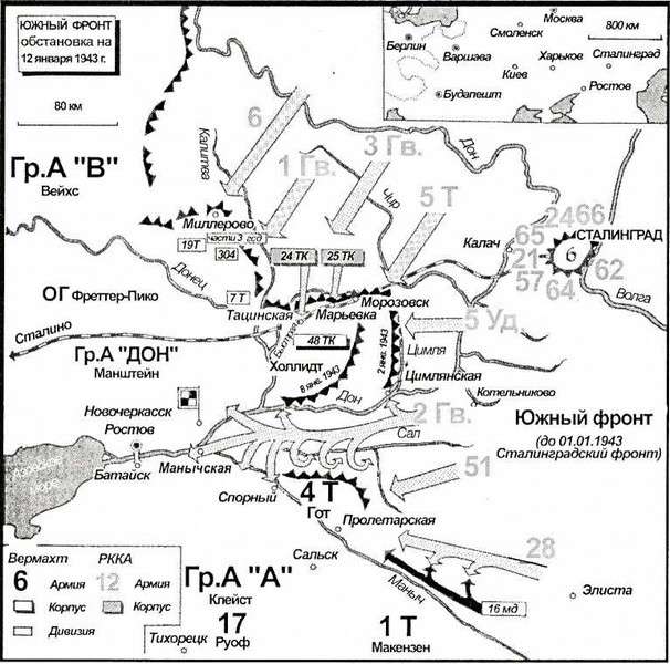 Операции трех советских фронтов, которые безостановочно наступали в междуречье Волги и Дона уже с 19 ноября 1942 года, которые окружили Сталинград и разорвали итальяно-румынский фронт на сотню километров, были нацелены на большее, чем только освобождение Сталинграда и окружение армии Паулюса. За этими действиями стоял грандиозный, захватывающий дух план советского Верховного Главнокомандования. Тщательно готовившийся долгое время, дорого оплаченный огромными жертвами, потерей армий, потерей территорий, реальной угрозой проигрыша всей войны, великий контрудар должен был наконец быть нанесен — здесь, у Волги, в сердце матушки-России, от Сталинграда, священного места большевистской революции. Все прежние ошибки будут искуплены, настало время великой битвы против Гитлера — время мощного удара, подобного удару по Наполеону, время истребления немцев на огромных просторах России. Сталин намеревался сокрушить ни много ни мало весь южный фланг немецких армий на Востоке. Суперсталинград для миллиона немецких солдат — вот какова была его цель. Посредством гигантской операции восьми армий, ударами на Ростов и нижнее течение Днепра из калмыцких степей и Среднего Дона он хотел отрезать и затем уничтожить немецкий южный фланг — три группы в семь армий в целом.