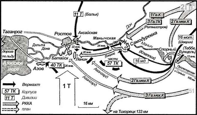 Только 20 января передовые части медленно наступавших сил Еременко форсировали Маныч у Манычской и двинулись на запад ь направлении Батайска. Передовым отрядом командовал полковник Егоров. Восемь Т-34, три Т-70, девять бронетранспортеров, пять разведывательных бронемашин и 200 стрелков на автомобилях выступили на великую цель — цель, которую они надеялись взять внезапным ударом. Главные силы 3-го гвардейского танкового корпуса ждали сигнала, чтобы последовать за ними. Все было тщательно спланировано. Много южнее 51-я армия двинула на Батайск 3-й гвардейский механизированный корпус с мощной танковой ударной группой. Дверь нужно было захлопнуть. Уже перерезали железнодорожную линию на Ростов и вышли к колхозу имени Ленина.