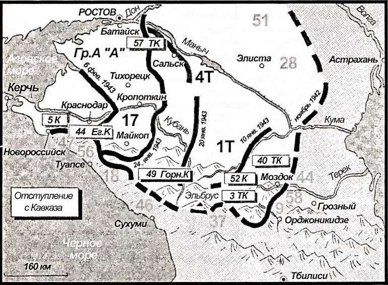 Крах Сталинграда и форсированный бросок русских к Дону означал, что их позиции в восточной части Черного моря, до горных перевалов вверху и нефтяных вышек внизу, теперь нельзя защитить. Им придется отступать. Армия уже была на марше. К тому моменту, когда над заснеженными степями донских казаков разнесся гром взрыва понтонного моста в Аксайской, как салют в честь спасения полутора миллионов человек 1 и 4-й танковых армий, 17-я армия на Западном Кавказе тоже, можно сказать, свернула за угол. Самая сложная часть отступления была позади. Соединения генерал-полковника Руоффа после отхода 1-й танковой армии с Терека в начале января должны были оставаться на своих позициях, чтобы русские не прорвались во фланг группы армий «А» Клейста. 10 января 49-й горнострелковый корпус наконец покинул свои позиции в высокогорье Кавказа и начал отход в район Майкопа.