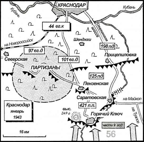 Когда русские переформировались, их главной целью стала дорога Саратовская — Краснодар, по которой отступали немцы. Эта единственная магистраль на север, известная как «Сталинское шоссе», в любую погоду оставалась проходимой даже для тяжелых машин. Русские прилагали отчаянные усилия, чтобы завладеть ею. Большие леса предоставляли им удобные плацдармы для наступления. В течение нескольких месяцев боевые группы и партизанские отряды просачивались в район южнее Краснодара. Немецкая линия фронта была столь неплотной, что это становилось неизбежным. Опасный партизанский край, соответственно, постепенно разрастался. Снова и снова в немецком тылу вылавливали то группу, то руководителя партизан.