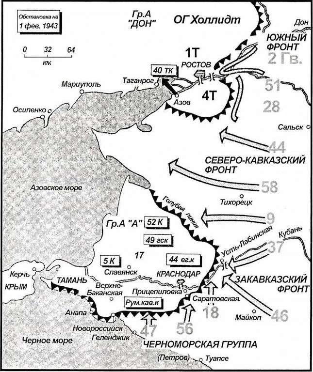План отступления предписывал 17-й армии выводить войска из района в район в северо-западном направлении через «Голубую линию» на плацдарм в нижних плесах Кубани. Гитлер задумал создать там своего рода стартовую площадку в Азию, где будут находиться 400 000 человек, готовые летом 1943 года снова двинуться в направлении Кавказа и его нефтяных промыслов. Базой этого плацдарма должен был стать Крым.