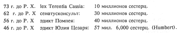 Что касается сословных прав на даровой хлеб, то в этом отношении предполагалось совершенное равенство. От вельможи до нищего, каждый при желании мог воспользоваться правом кормежки на государственный счет. И в эпоху Цицерона, повидимому, некоторые большие баре, вроде консулятора Л. Пизона Фруги, щеголяя демократизмом, подчеркнуто замешивались в ряды plebis frumentariae. Нравственный ценз тут тоже не принимался в расчет: «Общественный хлеб выдается — хоть вору, клятвопреступнику, прелюбодею, лишь бы был внесен (incisus) в списки выдачи. Все что дается человеку в силу признания его гражданского звания, а не в отличие его добрых качеств, все это получают в равной степени как добрые, так и злые». (Сенека) Всесословность фрументариев подтверждается Аппианом и Плутархом, но Моммсен. Гришфельд и Марквардт полагают, что Цезарева реформа даровой раздачи, заключив число льготников в определенные рамки, тем самым устранила из них лиц сенаторского и всаднического звания. Самые имена льготников у авторов — plebs frumentaria, dcloz (чернь), plhzoz (толпа), арооі (бедняки) — показывают, что обычное право исключило сенаторов и всадников, т.е. крупных цензовиков, из привилегии, в которой не отказывал им закон. Зачисление в получатели производилось по жребию (sortitio), который тянули преторы. Система даровой раздачи хлеба влекла за собой огромные потери для государственной казны. Цицерон считает, что уже тем, что отказалось взимать с прежних льготных покупателей 6 1/3 асса за модий, государство потерпело убытки в размере пятой доли всех своих доходов от косвенных налогов (vectigalia). Плутарх вычисляет ежегодную потерю в 1250 талантов, около 7 миллионов франков, 2 1/2 миллиона рублей. В 691 году (63) Катон довел расход по выдачам до 30 миллионов сестерциев (Моммсен). По таблице роста экстренных ссуд, которыми государство время от времени поддерживало институт даровой раздачи, легко заметить огромный рост нуждающегося населения в Риме, равно как и его развращение привычкой в казенной подачке.