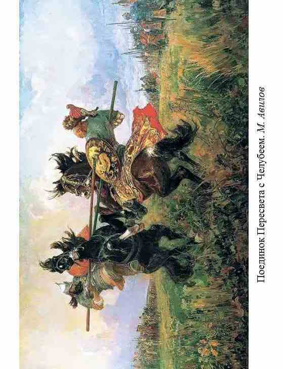 Сначала, по древнему обычаю, в поединке сошлись два конных богатыря – русский чернец Пересвет, присланный Сергием Радонежским, и татарский витязь, которого наша летопись называет Челубеем. Они кинулись друг на друга с таким пылом, что оба погибли, то ли пронзенные копьями, то ли просто от столкновения. Двойная смерть предвещала ожесточенную и кровопролитную схватку. (Впрочем, не исключено, что этот картинный поединок является позднейшей легендой.)