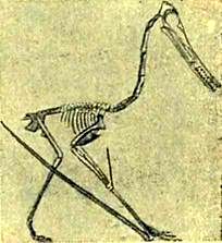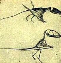 Маленький длиннохвостый птеродактиль. Вверху он нарисован отдыхающим на земле; внизу показано, как он держал крылья, когда бегал.