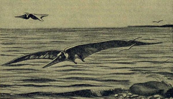 «Это был как бы огромный, чудесно разработанный летающий механизм, — говорит о птеранодоне один ученый, — механизм, изумительно совершенный во всех деталях, действующий автоматически и мгновенно отвечающий на каждый порыв ветра. Я точно вижу птеранодона парящим над широким сверкающим морем, высматривающим с высоты неосторожно поднявшуюся к поверхности моря рыбу. От зари до зари дежурит он в небе, летая то туда, то сюда и изредка присаживаясь на камни. А к ночи он снова устремляется в полет, отмахивая много-много километров, чтобы попасть на какой-нибудь далекий остров и переночевать там на давно облюбованном дереве или крутом уступе».